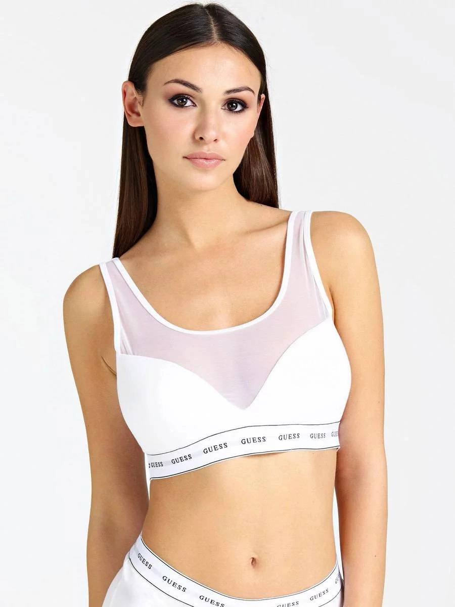 Bralettka z nové kolekce Guess s vyztuženými košíčky a originálním designem žerzeje ve výstřihu.