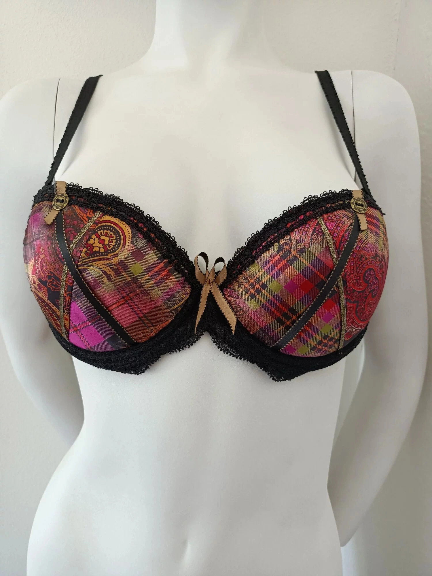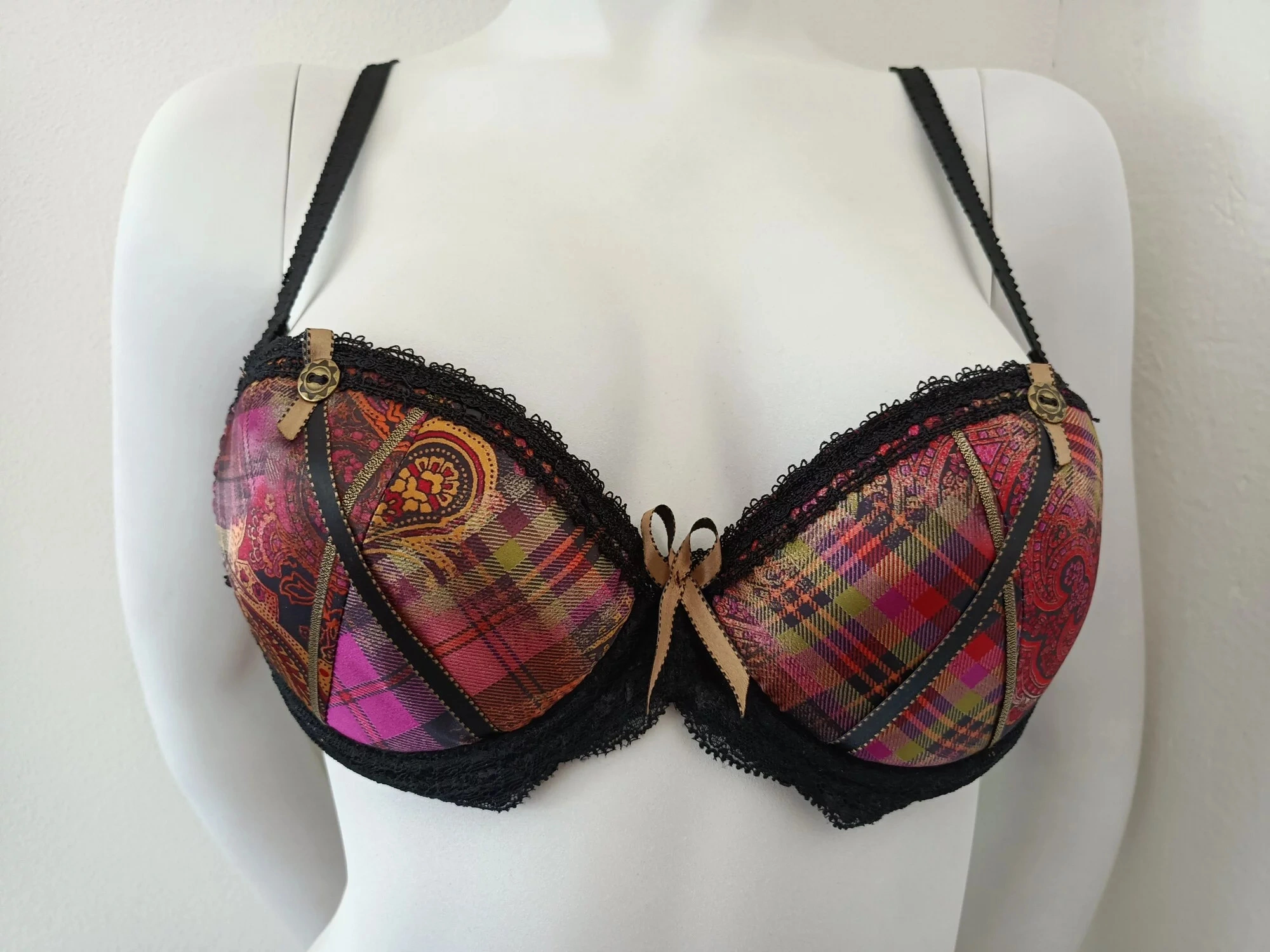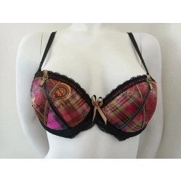Dámská vyztužená podprsenka, s kosticemi. Možnost vložení další výztuhy. Ramínka jsou odepínací, posouvací. Vzadu zapínání na dva háčky.