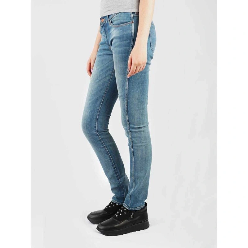 Dámské džínové kalhoty s nízkým sedem, zúženými nohavicemi, poklopcem na zip a koženou nášivkou s logem na zadní kapse.