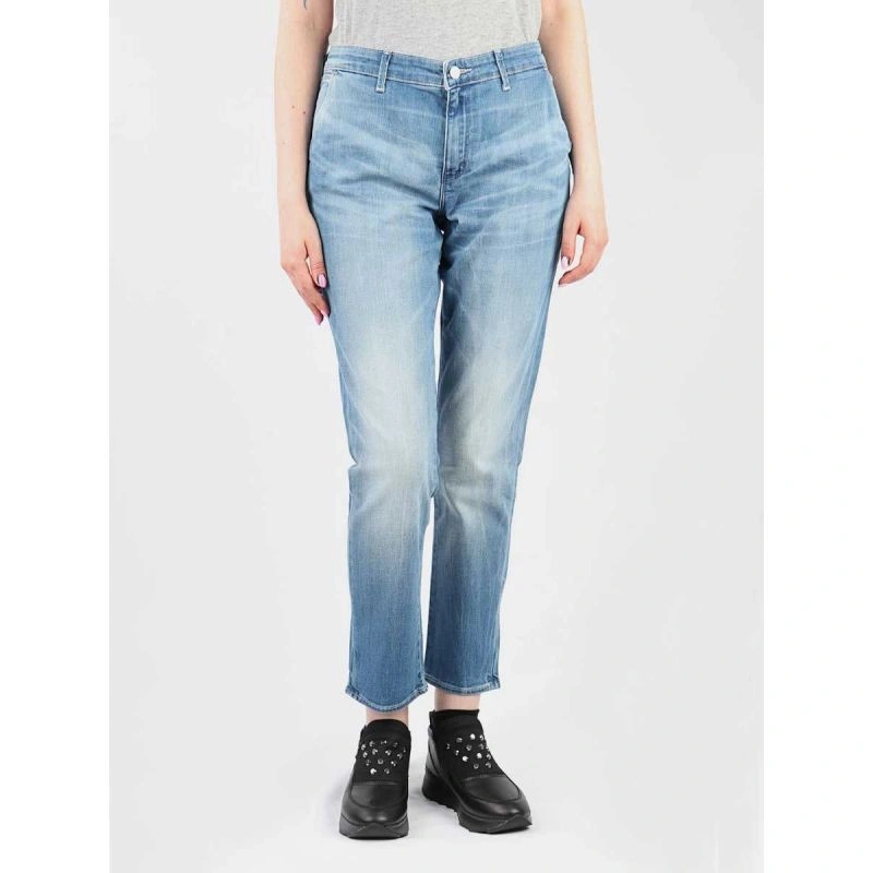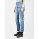 Dámské džínové kalhoty s vysokým pasem, zúženými nohavicemi, zapínáním na zip a knoflík.