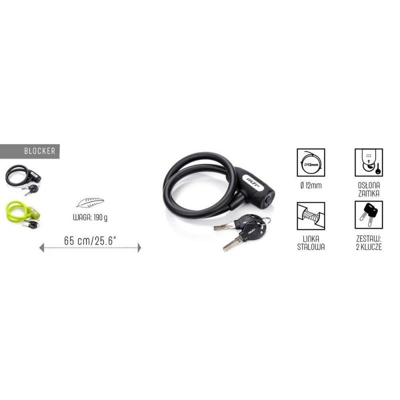 Odolný zámek na jízdní kolo v podobě ocelového lanka o průměru 4,5 mm, potaženého plastem . 2 klíče jsou součástí balení. Zámek zámku je vybaven krytem, který chrání mechanismus před znečištěním.