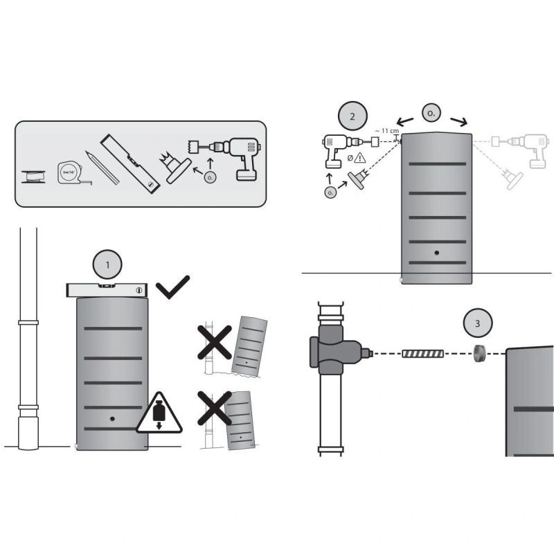 Nádrž je nadzemní, umístěná přímo na zemi a připevněná k okapům pomocí speciálních otvorů, které si musíte udělat sami, nepotřebuje speciálně připravený výkop a budování složité instalace.