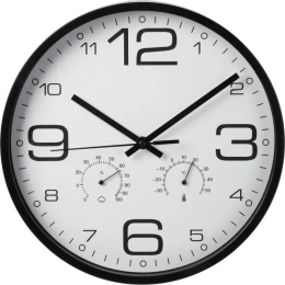 NÁSTĚNNÉ HODINY 30CM S TERMOMETREM ČERNÉ jsou moderní hodiny s přehledným zobrazením času, teploty a úrovně vlhkosti. Mají jednoduchý, minimalistický design a jsou ideální do kanceláří, moderních interiérů i na pracoviště.