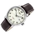 Stříbrný obal s klasickým tvarem obklopuje krémově bílý ciferník, který upoutá pozornost jemným matováním a hloubkou barev, dokonale ladící s přesnými černými indexy a ručičkami s fluorescenční výplní pro čitelnost za všech podmínek. Dynamický charakter podtrhuje stříbrná vteřinová ručička a celek završuje tmavě hnědý kožený řemínek s kontrastní bílou nití, který dodává eleganci a noblesu, dokonale ladící se stříbrnou sponou a korunkou. Jedná se o kvintesenci stylu a sofistikovanosti, kde byl každý detail navržen s ohledem na dokonalost.