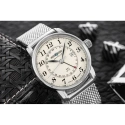 Stříbrný plášť, lesklý a pevný, je základem celého designu, který upoutá pozornost svou jednoduchostí a nadčasovou formou. Ušlechtilá béžová barva číselníku, teplá a tlumená, připomíná interiéry historických vzducholodí a zachycuje atmosféru doby velkých cest. Výrazné černé číslice a indexy dokonale kontrastují s pozadím číselníku, poskytují vynikající čitelnost a zároveň vnášejí nádech klasické elegance. Ručičky v odstínech stříbrné a černé dodávají hodinkám výraz, zatímco přesná vteřinovka s jemným červeným akcentem přitahuje pozornost a zdůrazňuje funkčnost hodinek. Vzhled doplňuje síťovaný náramek z odolné nerezové oceli, který nabízí lehkost, pohodlí a letecký styl, jenž podtrhuje jedinečnost tohoto modelu.