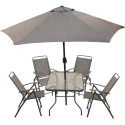 Přineste sobě, své rodině a přátelům nádech luxusu během večírků nebo grilovacích sešlostí. Souprava obsahuje 4 pohodlná skládací křesla a elegantní stůl s deskou z 5 mm silného tvrzeného vlnitého skla a cca 250 cm širokým (průměr rozloženého slunečníku) a skládacím slunečníkem, který ochrání vás i vaše hosty před pálícím sluncem. Křesla lze kdykoli složit, což se vám bude hodit například při sekání trávníku.