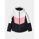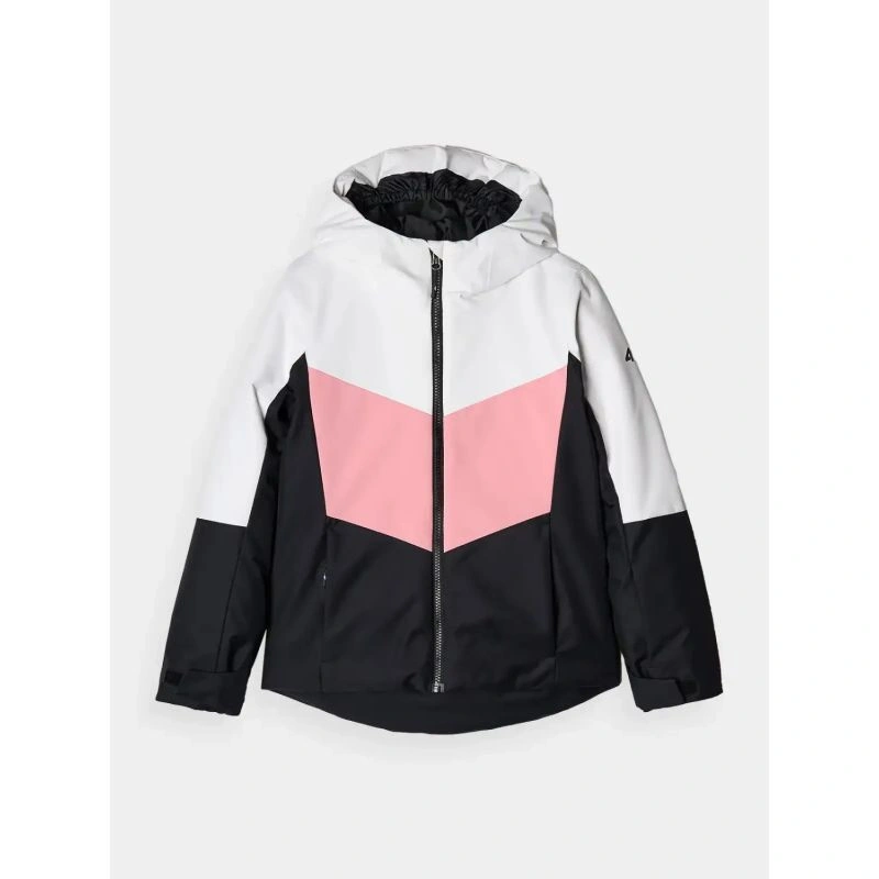 Dívčí lyžařská bunda s kapucí, technologicky přizpůsobená pro sportovní, mírné aktivity i každodenní použití, s pravidelným střihem, který se pohodlně přizpůsobí postavě, a standardní délkou, která sahá až k linii boků.
