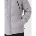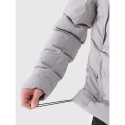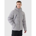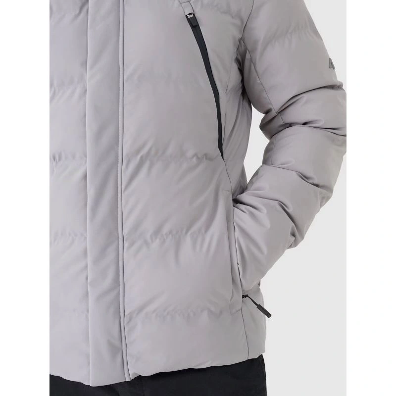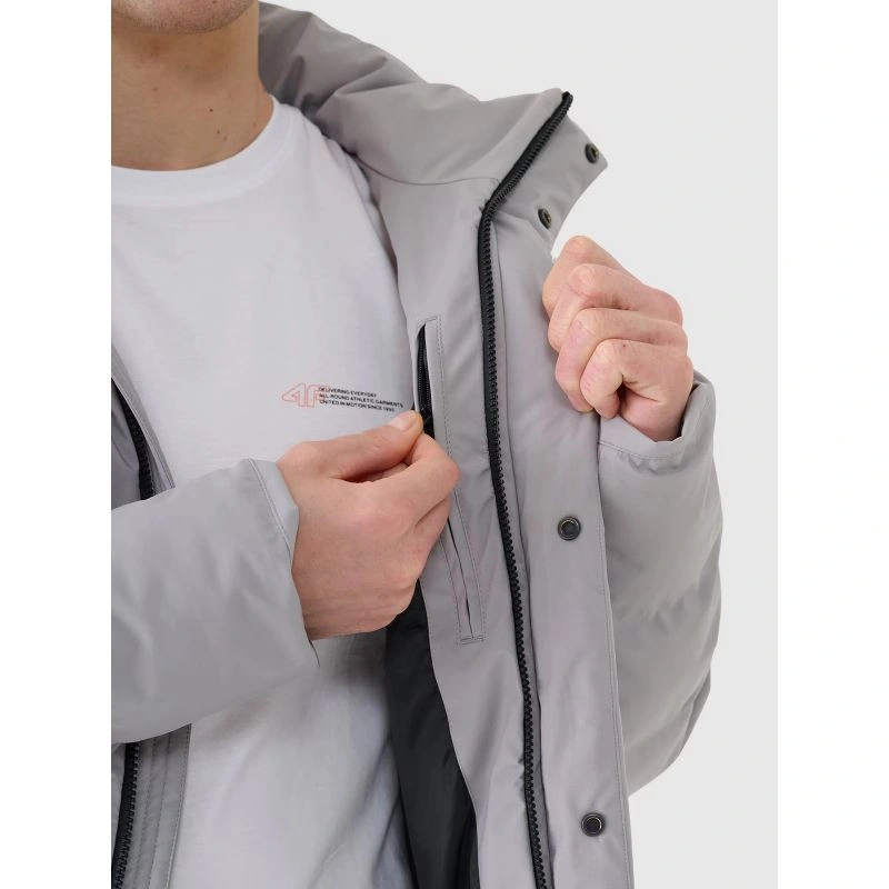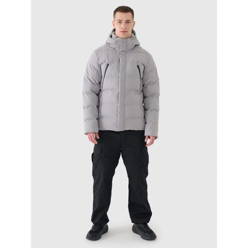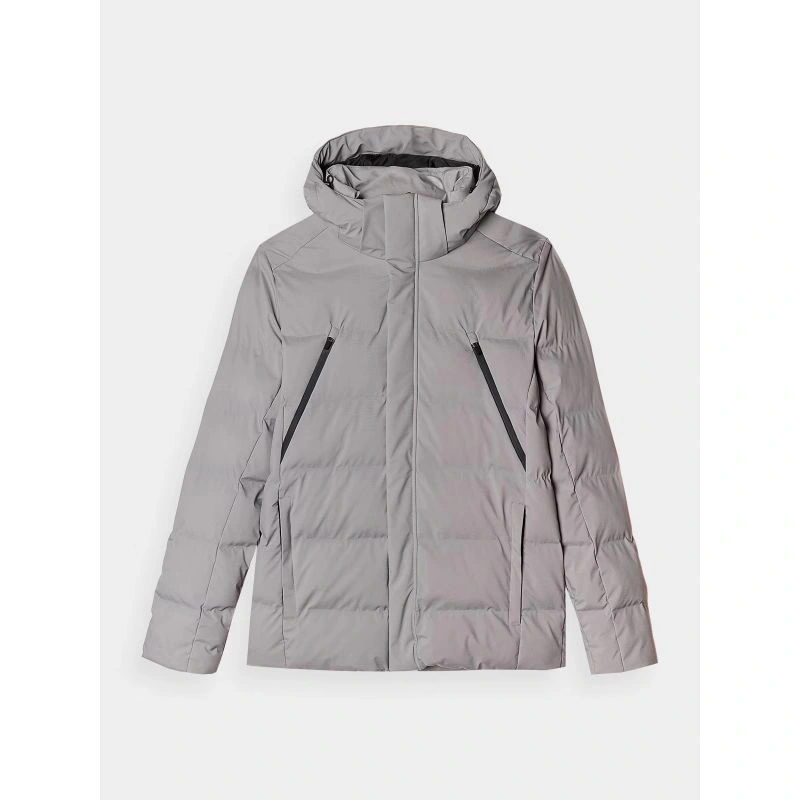Kurtka puchowa z kapturem męska jest wyposażona w odpinany kaptur z regulacją objętości. Szyję osłania wysoki kołnierz, który dodatkowo zabezpieczy przed chłodem i wiatrem. Rękawy zakończone są mankietami bez regulacji. Przedłużone wewnętrzne dzianinowe mankiety osłonią nadgarstki przed zimnym wiatrem. Po bokach znajdują się 2 kieszenie zapinane na zamek. Dodatkowo na klatce piersiowej umieszczono 2 kieszenie z zapięciem na zamek. Natomiast w środku znajduje się kieszeń z zapięciem na zamek, która pozwala na bezpieczny transport cennych przedmiotów, np. telefonu.Kurtka puchowa dla mężczyzny jest zapinana na jednokierunkowy zamek główny z wewnętrzną i zewnętrzną plisą przeciwwiatrową, która ogranicza przenikanie chłodu do wnętrza kurtki. Obwód dołu można wyregulować przy użyciu tunelowego ściągacza ze stoperami.