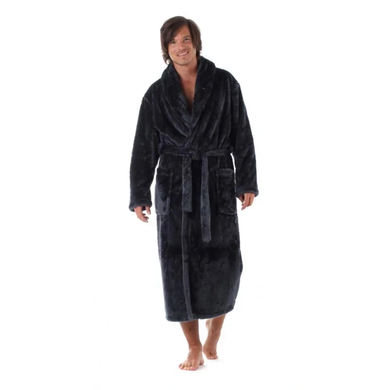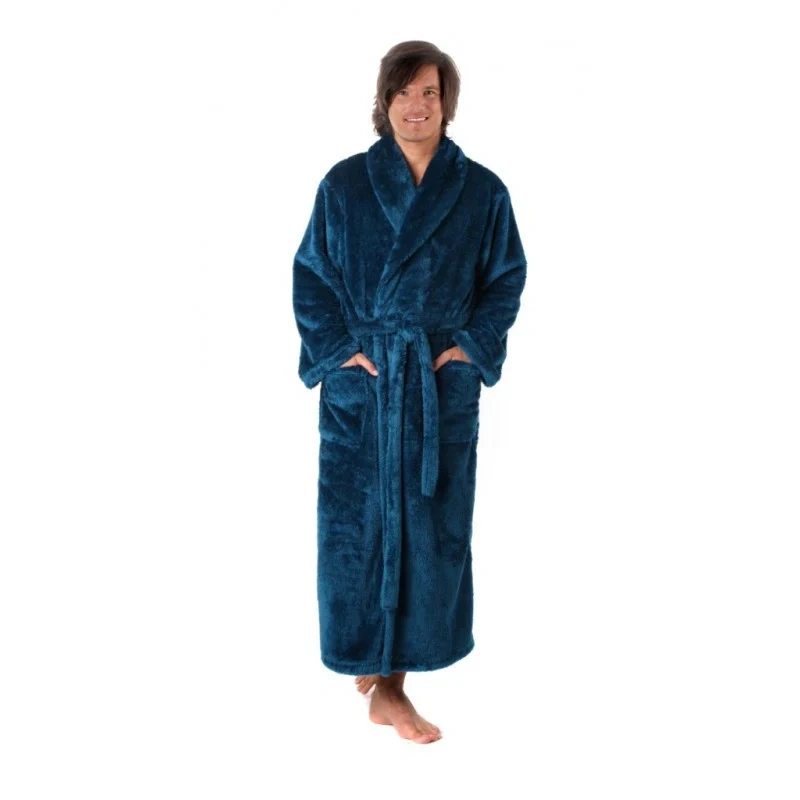 Lehoučký hebký a hřejivý župan v temně modré barvě. Župan má šálový límec, dvě kapsy, pásek a klasi